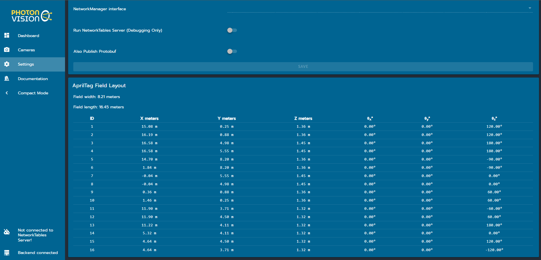 PhotonVision ships by default with the 2025 welded field layout JSON. The layout can be inspected by navigating to the settings tab and scrolling down to the “AprilTag Field Layout” card, as shown below.