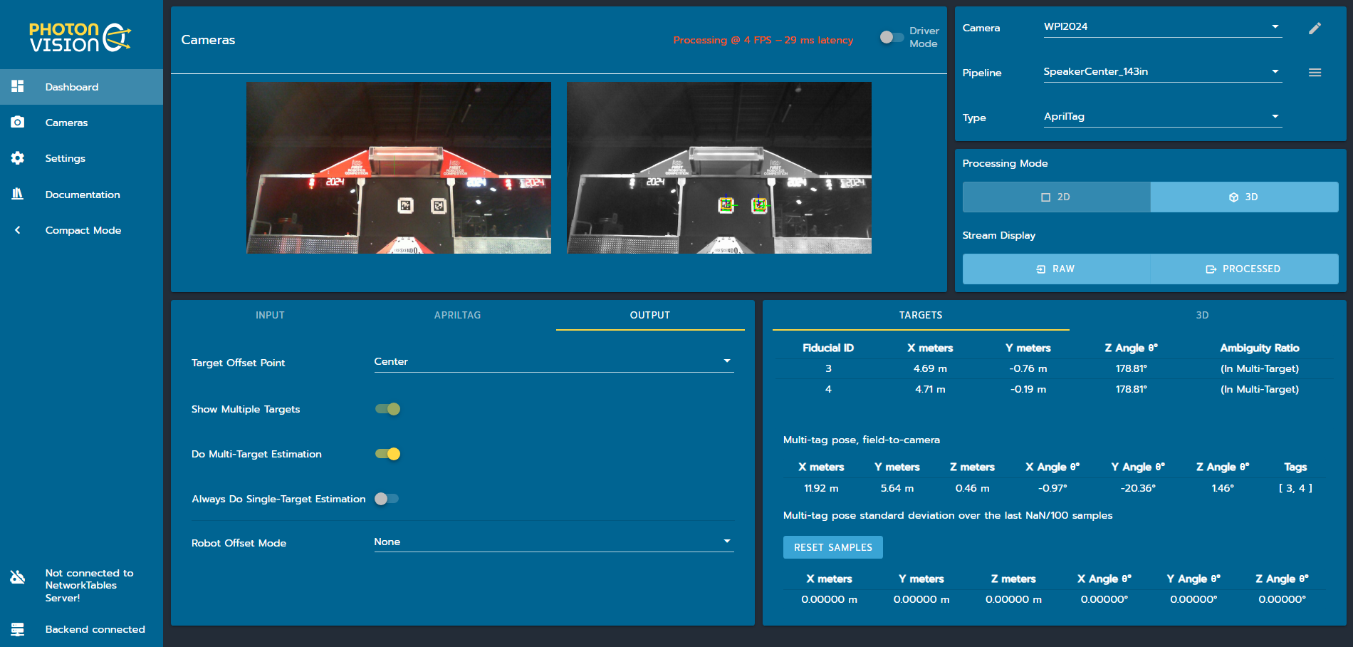 Ensure that your camera is calibrated and 3D mode is enabled. Navigate to the Output tab and enable “Do Multi-Target Estimation”. This enables MultiTag to use the uploaded field layout JSON to calculate your camera’s pose in the field. This 3D transform will be shown as an additional table in the “targets” tab, along with the IDs of AprilTags used to compute this transform.