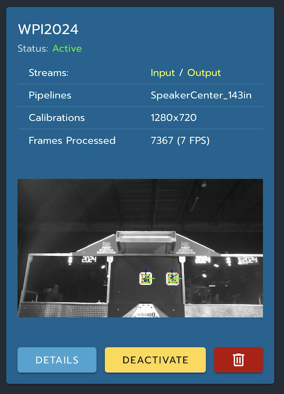 Once a camera is activated, it will be listed as “Active” in the camera list. You can press the “Deactivate” button to stop PhotonVision from using the camera.