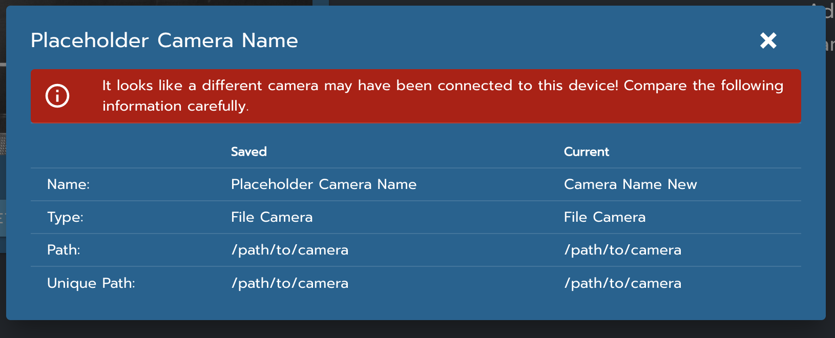 Additionally, pressing on the Details button will show you the details of the camera mismatch, allowing you to compare the current camera with the previously configured camera.