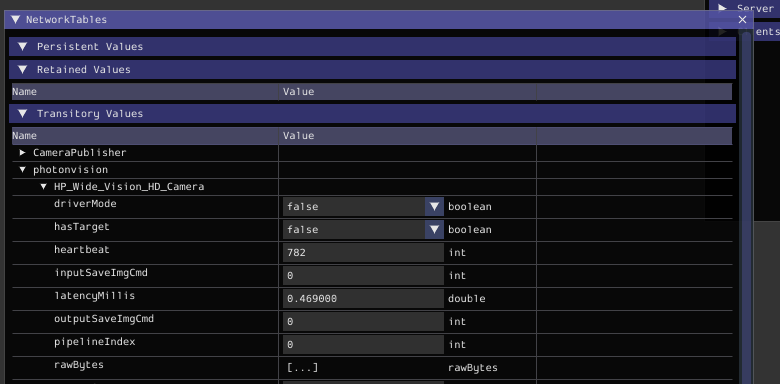 PhotonCamerain code, does thecameraNameprovided match the name in the upper-right card of the web interface? Glass can be used to verify the RoboRIO is receiving NetworkTables data by inspecting thephotonvisionsubtable for your camera nickname.