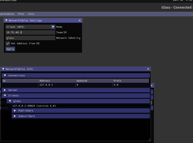 Use Glass to verify that PhotonVision has connected to the NetworkTables server served by your robot. With Glass connected in client mode to your RoboRIO, we expect to see “photonvision” listed under the Clients tab of the NetworkTables Info pane.